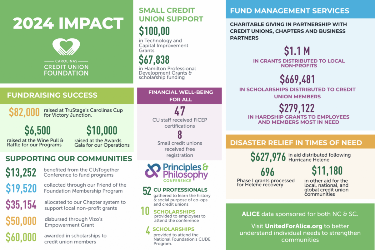 The Carolinas Credit Union Foundation’s 2024 Impact Report is now available, and we invite you to explore its pages — not just to see the numbers, but to feel the heart behind them. Each grant and each scholarship represents lives touched, and opportunities created — all made possible by the generosity and commitment of people like you. We express deep gratitude to the Carolinas Credit Union League and our Board of Directors, and every donor, partner, and credit union represented in our report. Your support, leadership, and shared vision have carried our mission forward.