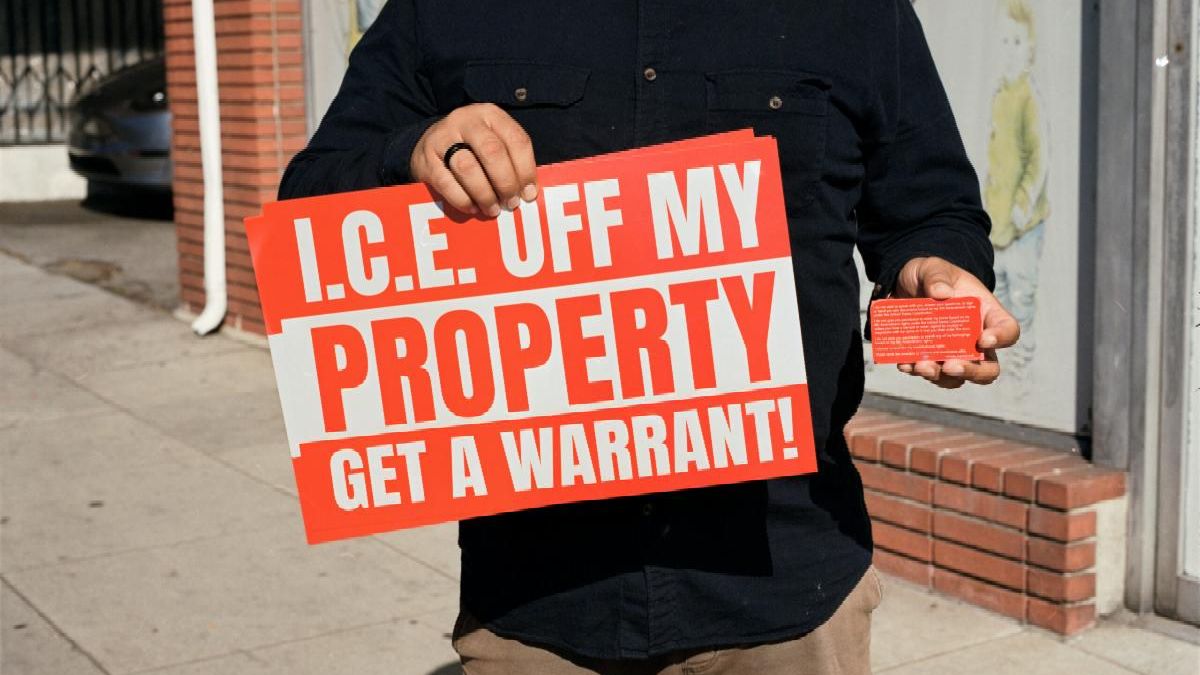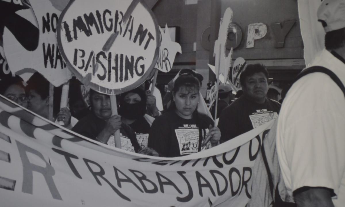 The Multi-Ethnic Immigrant Workers Organizing Network (MIWON) formed in the year 2000 to support immigrant and undocumented immigrant labor rights across Los Angeles. The coalition brought together the Coalition for Humane Immigrant Rights (CHIRLA), Instituto de Educación Popular del Sur de California (Institute for Popular Education of Southern California, IDEPSCA), Koreatown Immigrant Workers Alliance (KIWA), the Pilipino Worker Center (PWC), and later the Garment Worker Center (GWC), among other organizations. Pictured here: a scene from MIWON’s May Day march in 2003, where protestors connected “immigrant bashing” in Los Angeles and the United States government’s invasion of Iraq weeks earlier.