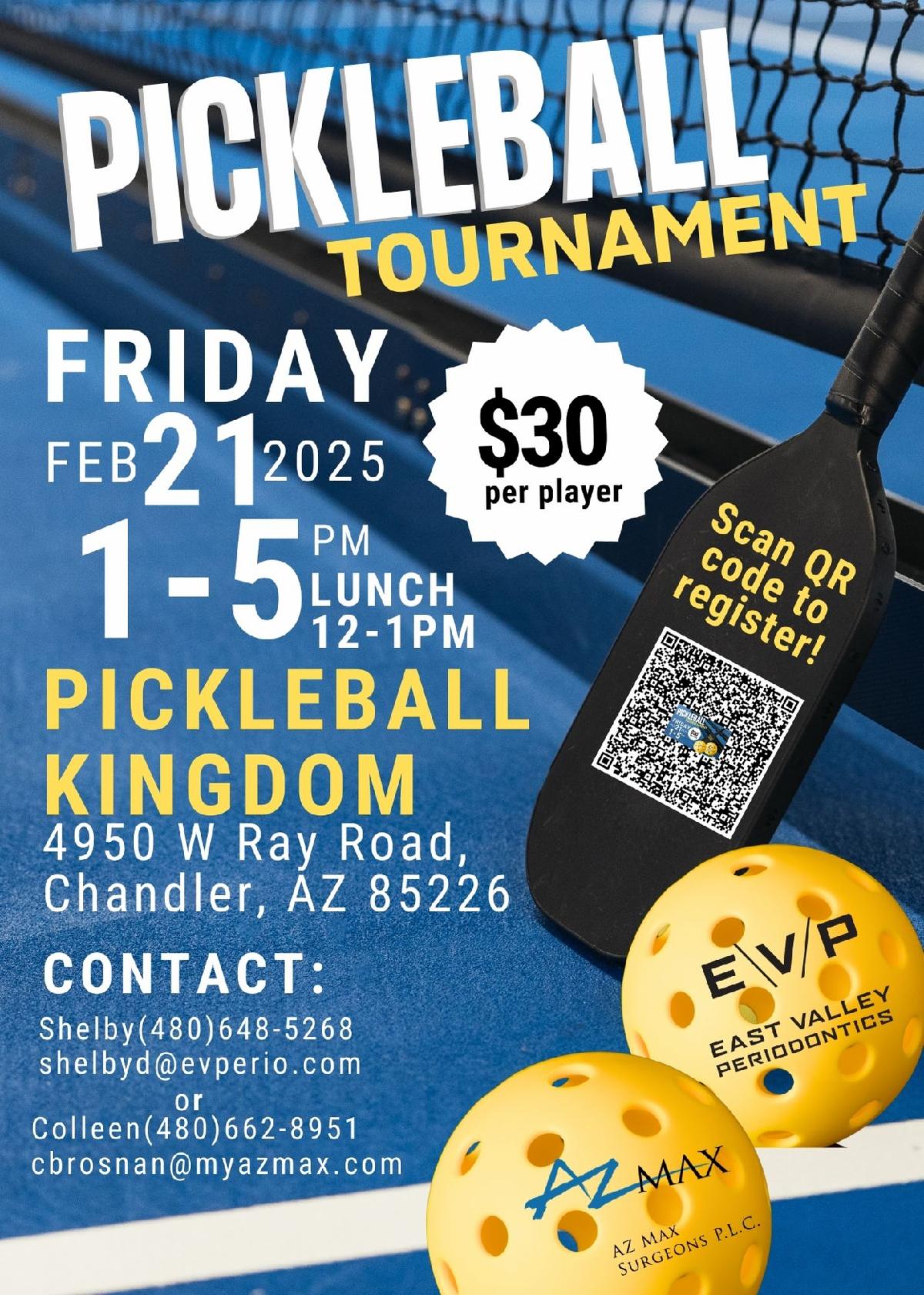 We are thrilled to invite you to the East Valley Periodontics and Az Max Pickleball Tournament—a day packed with fun, friendly competition, and great company!