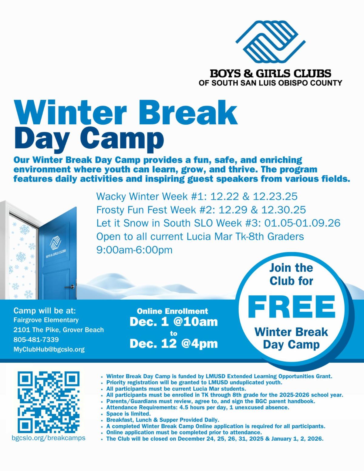 We still have a few spots available for our Before Winter Break Day Camp! Visit bgcslo.org/breakcamps for more information and to enroll. If you are interested in being added to our waitlist for the Winter Break Day Camp please email MyClubHub@bgcslo.org.