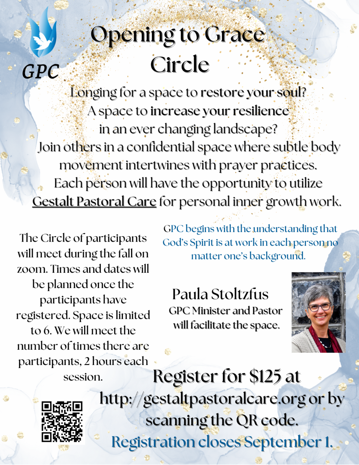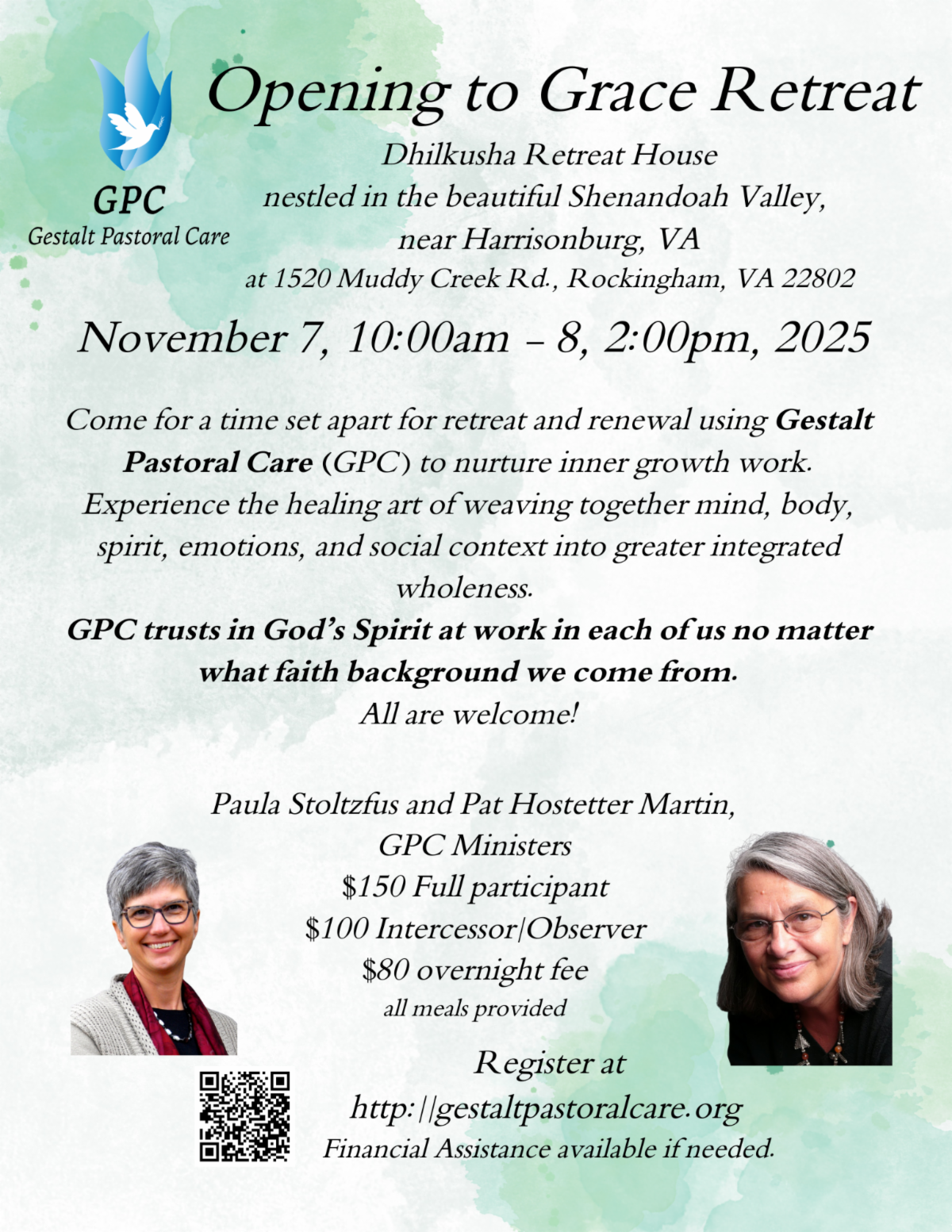 Join us for the Opening to Grace Retreat at Dhilkushā Retreat House in the Shenandoah Valley. Facilitated by GPC Ministers Paula Stoltzfus & Pat Hostetter Martin, this retreat invites you to nurture your inner growth through prayer, body awareness, and Gestalt Pastoral Care practices.