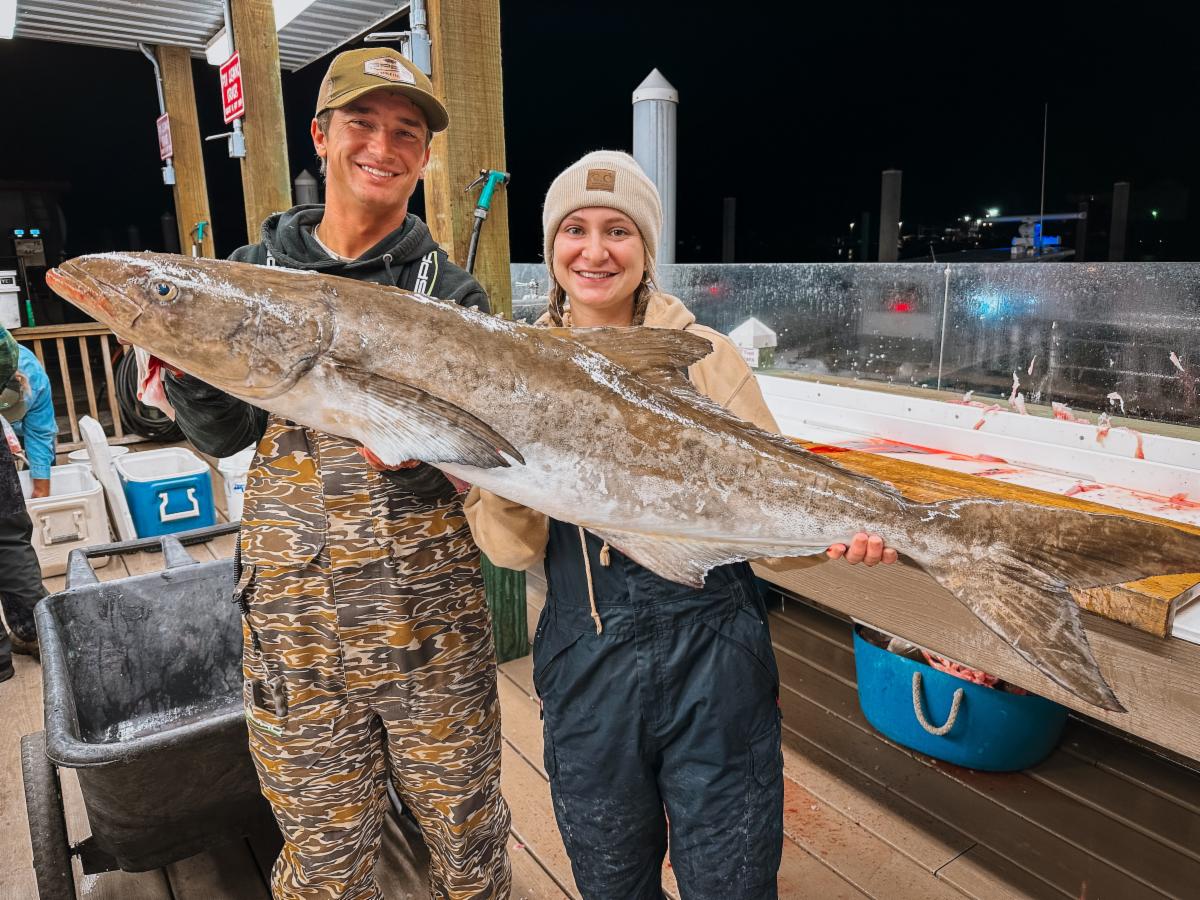 | Capt. Chase and his girlfriend, Lori, held up the monster cobia they brought back from an offshore fishing trip. | |