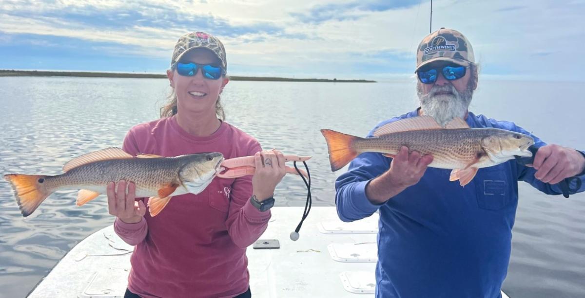 Mandy and Steve caught these two redfish together with Capt. Chris Chico Graham of OTF Inshore Charters.