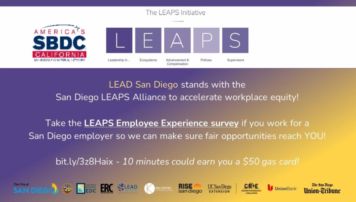 Take and share this with your San Diego employees. Women’s work success boosts economies, equitable communities are healthier and less violent, and equitable businesses are 30% more profitable. Be part of this survey study for business employees to share their thoughts anonymously, and for businesses to help drive local economy diversity, empowerment, and thus success. Plus thanks to MyPoint Credit Union, survey takers could receive one of four $50 gas cards! The survey deadline is June 30. Take or share it here!