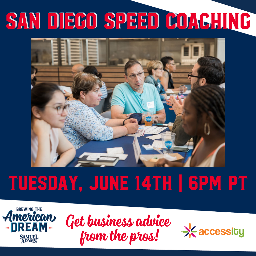 You won't want to miss this in-person offering from our partner Accessity. Kick off with a networking reception featuring beer from Samuel Adams and food from an Accessity-funded business. Business owners will also have the chance to meet with Sam Adams experts to receive personalized coaching and network with other entrepreneurs! Learn more and grab your spot now to join us this week, tomorrow, Tuesday, June 14 at 6 p.m. Don't miss out on this fantastic opportunity to receive expert speed coaching.