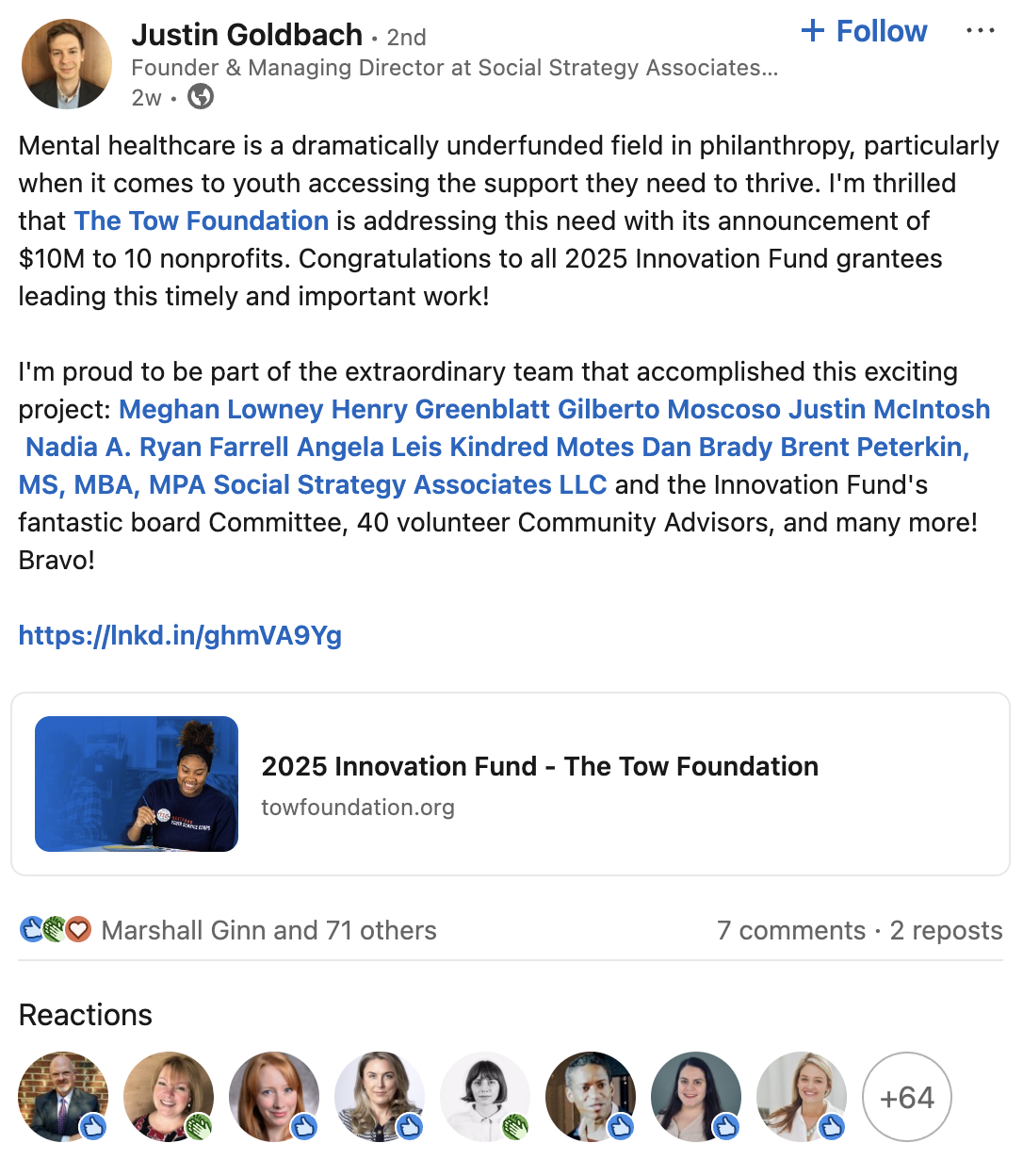 Social Strategy Associates, Justin Goldbach's firm, project managed The Tow Foundation's 2025 Innovation Fund, which recently announced $10M in grants to nonprofits — expanding access to youth mental health and well-being.