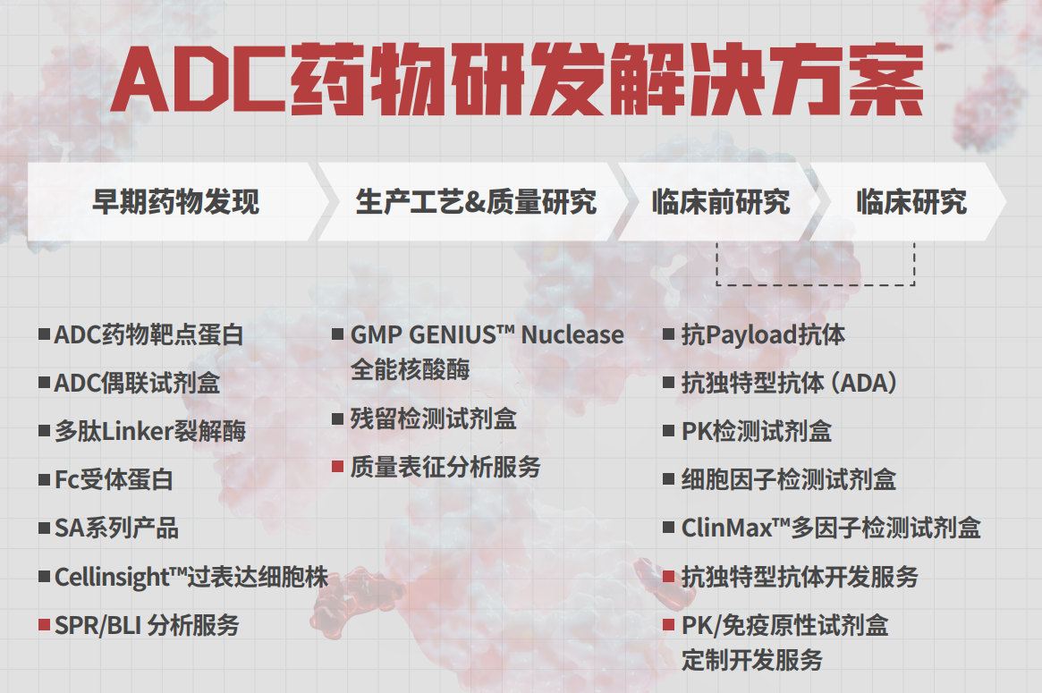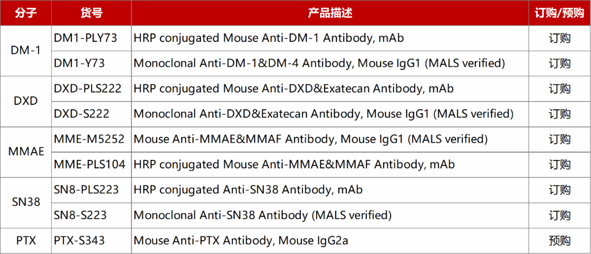 为了解决ADC药物PK分析中的挑战和难点,ACROBiosystems百普赛斯发布高质量、高亲和力抗小分子抗体,包括抗MMAE抗体、抗DXD抗体、抗SN38抗体、抗DM1抗体等,可用于ADC进行临床前及临床阶段的PK检测以及DAR值分析,为提高ADC药物PK分析的准确性和可靠性提供了有力的支持和保障。
