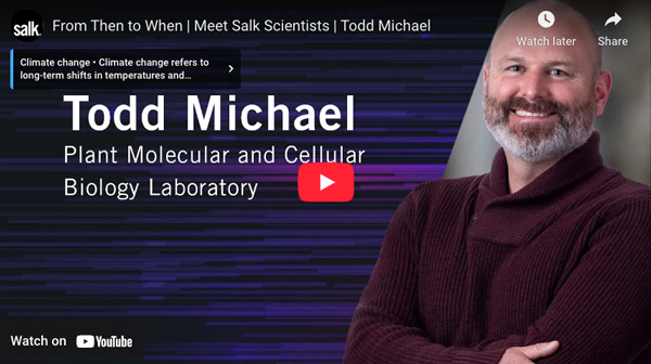 The āFrom Then to Whenā video series brings you the unique stories of Salk researchers, from their personal journeys into science to their motivations and goals for the future. This month, we feature Research Professor Todd Michael, a plant biologist focused on decoding plant genomes to identify ways to protect those plants from climate change. | |