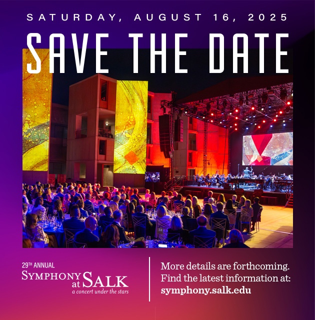 Save the Date for the 29th Annual Symphony at Salk: Saturday, August 16 | Symphony at Salk is a treasured tradition where guests enjoy a champagne reception, a gourmet dinner in Salkās iconic courtyard, and an incredible performance by the San Diego Symphony and a musical artist. Past artists have included such stars as Jennifer Hudson, Josh Groban, Idina Menzel, and Liza Minnelli. More details are forthcoming. Find the latest information at symphony.salk.edu. | |