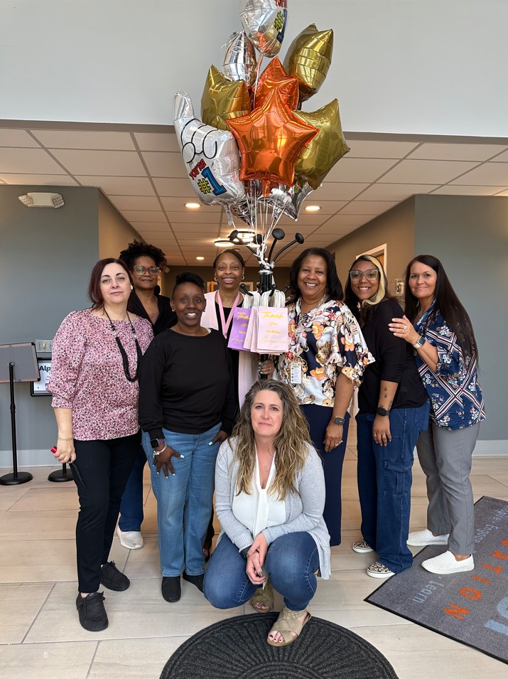 Left to right: Perwin Al-Hakeem, Shannon Griffin (back row), Laytoria Rutherford (front), Teesha Peak (by the balloons), Jessie Schillingburg (kneeling), Glynis Taylor (our district partner), Rayna Dias-King, and Donna Davies.