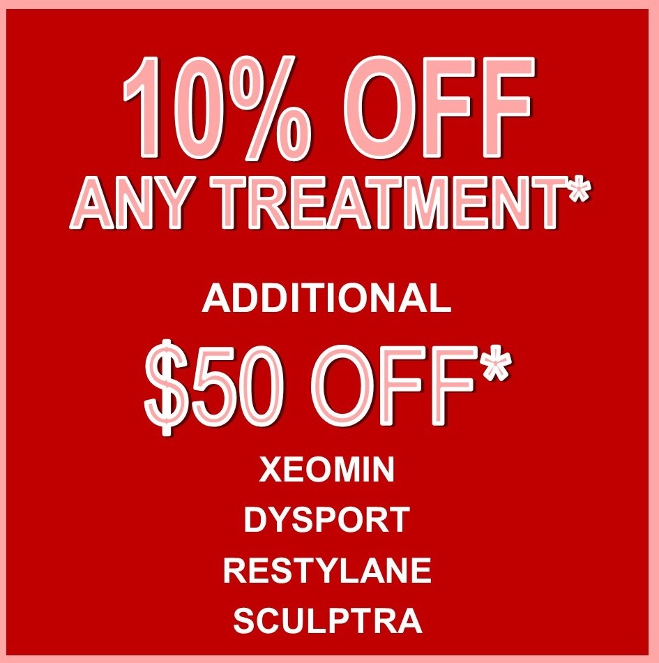 *February Promotions – Save up to $150 with Aspire Rewards. Save additional $50 off Xeomin treatment with Merz Xperience. All promotional treatments must be used by February 26th, 2026. 10% off promotion cannot be combined with any other offer, coupon, voucher, or certificate except Merz Experience, Aspire Rewards, or Gift Certificates. 10% off not valid for treatment packages, weight loss, wellness injections or spa services. No cash value. No banking. No Care Credit. Minimum Xeomin treatment 30 Units. Minimum Dysport treatment 90 Dysport Units. |
