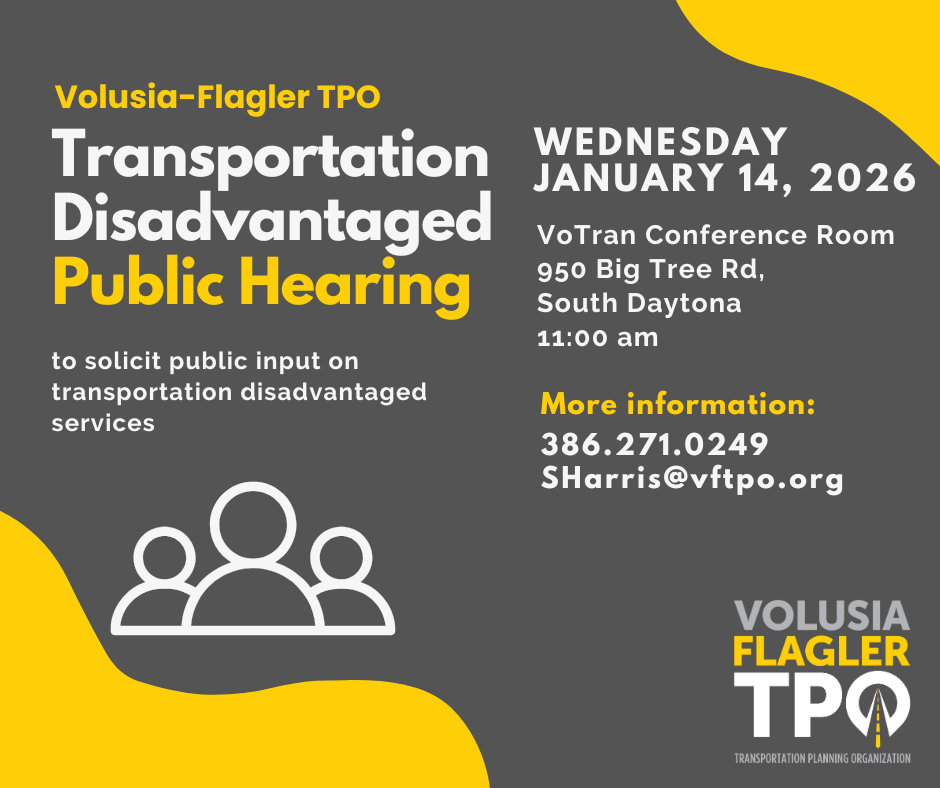 The Volusia-Flagler TPO Transportation Disadvantaged Local Coordinating Board (TDLCB) will hold its annual TD Public Hearing to solicit public input on transportation disadvantaged services in Volusia County on: