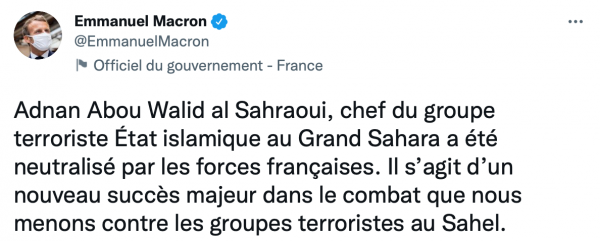 On 16 September 2021, President Emmanuel Macron announced the death of Adnan Abou Walid al Sahraoui, the leader of Islamic State in the Greater Sahara (ISGS) and the mastermind behind a number of high-profile killings and kidnappings in the region, including the ambush on US soldiers in October 2017. Macron deemed this to be "another major success" in the fight against Sahel terrorist groups. The elimination of al Sahraoui is one in a series of targeted strikes against leading figures and commanders of jihadist groups in the Sahel by the French army and its allies; it is likely one of the last major operations under the Barkhane before the final withdrawal.