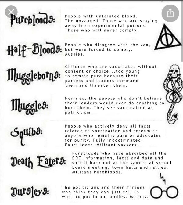 Recently, individuals against the COVID-19 vaccination, or "anti-vaxxers", have taken to social media platforms to announce that they no longer want to be called "unvaccinated," but instead request to be called "purebloods". This is a reference to a group of characters in the Harry Potter series written by J.K. Rowling. One poster published on Telegram, also makes reference to several other Harry Potter related terms to describe one's vaccination status. By dividing up individuals according to their vaccination status and assigning them labels with obvious positive or negative connotations created by this popular book series, these anti-vaxxers are portraying themselves as elite and better than everyone else on the list, creating a potential issue of discrimination based on vaccination status.