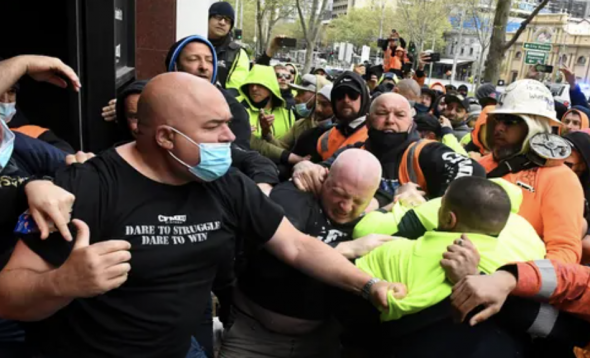 (COVID-19) Construction Industry Forced to a Standstill with a Two-Week Shutdown Following a Violent Anti-COVID Protest Outside the CFMEU Officers in Melbourne, Victoria, Australia