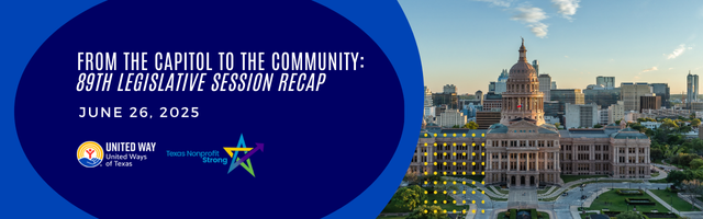 | | REGISTER NOW: 89th Texas Legislative Session Recap | Join us on Thursday, June 26, at 11 AM CT, for a rundown of what happened during the Regular Session of the 89th Texas Legislature — and what it means for nonprofits. We’ll cover major updates in health, education, financial security, and the nonprofit sector. Who should attend: Nonprofit leaders, staff, board members, volunteers, advocates, and anyone working to strengthen communities in Texas. Hosted in partnership with United Ways of Texas. | | | | |
