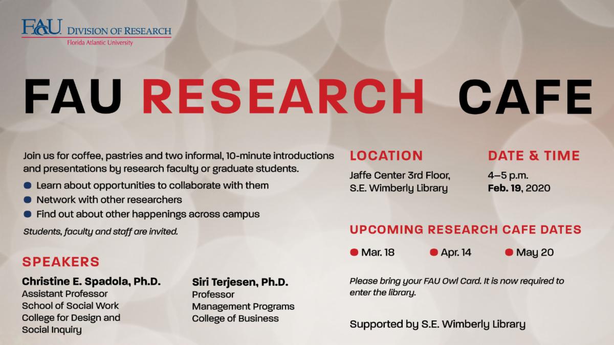 Learn about the amazing research that is happening across campus. Faculty and graduate students will present their studies over coffee and pastries.