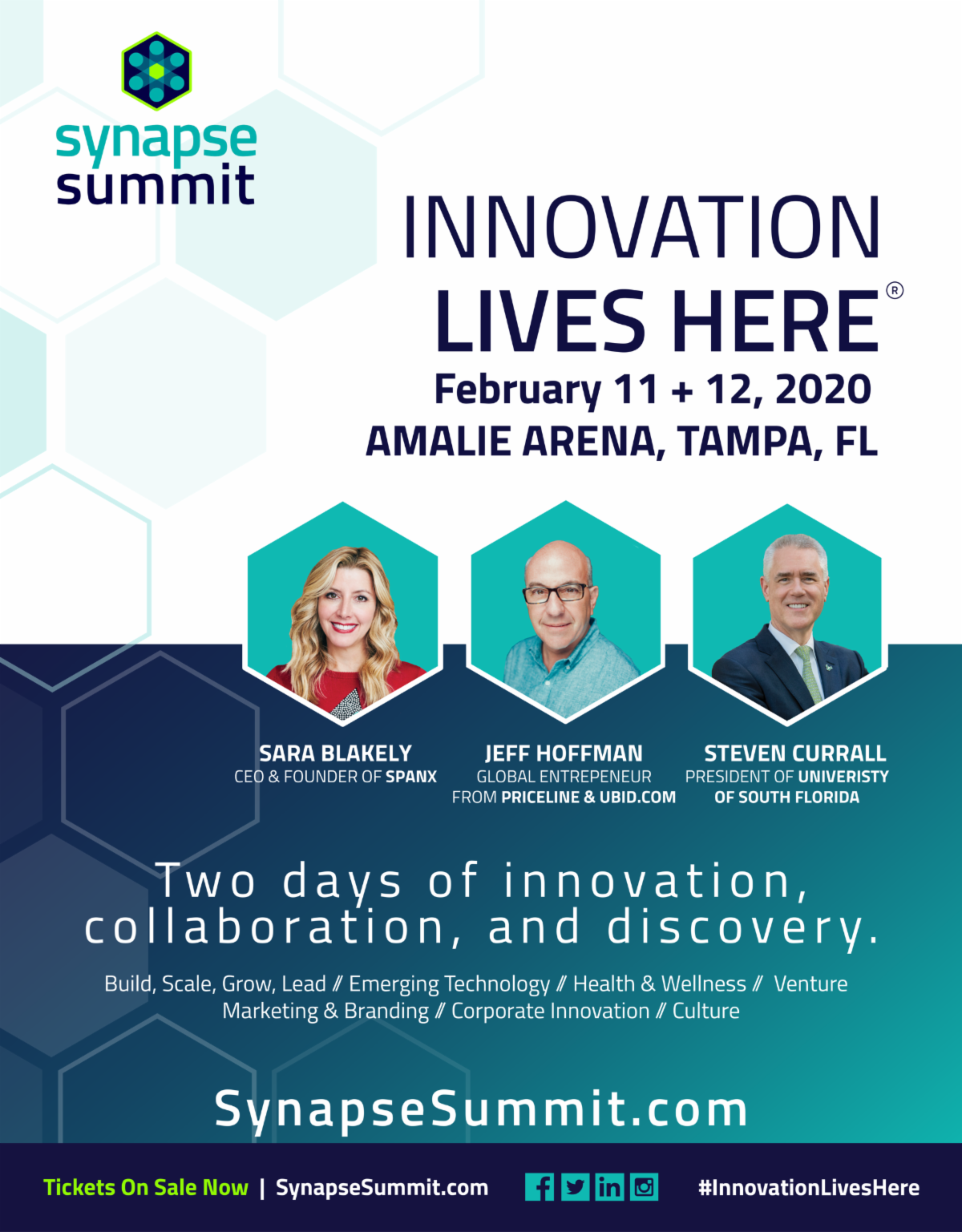 Synapse Summit 2020 will feature internationally renowned keynote speakers Sara Blakely, founder and CEO of SPANX, Inc., Jeff Hoffman, global entrepreneur from Priceline; Ubid.com, and Steven Currall, President of the University of South Florida and innovation author.
