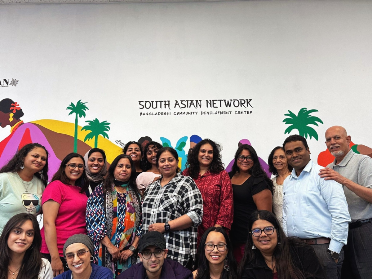 This photo was taken at the SAN office in Little Bangladesh in front of a mural painted by a local South Asian artist, Ragni Agrawal. The mural was intentionally left with plenty of space with the thought that we'd like to encourage other South Asian artists to showcase their work by adding to the mural. | |