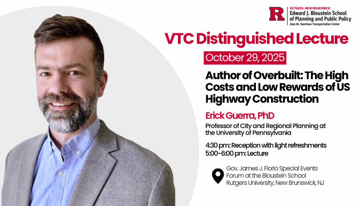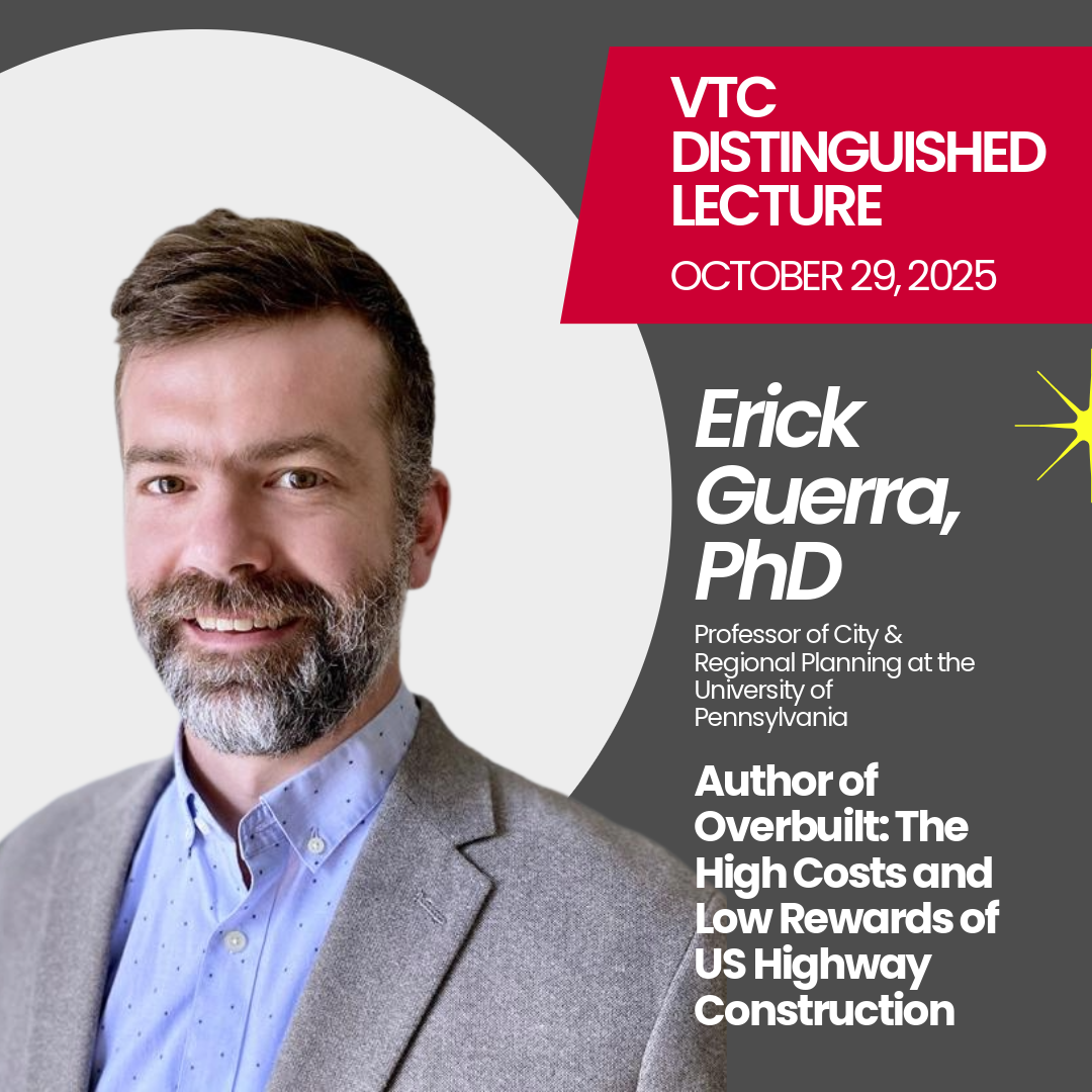 Join us on Wednesday, October 29th, 2025 for the VTC Distinguished Lecture with Dr. Erick Guerra featuring an engaging talk about his new book, Overbuilt: The High Costs and Low Rewards of US Highway Construction.