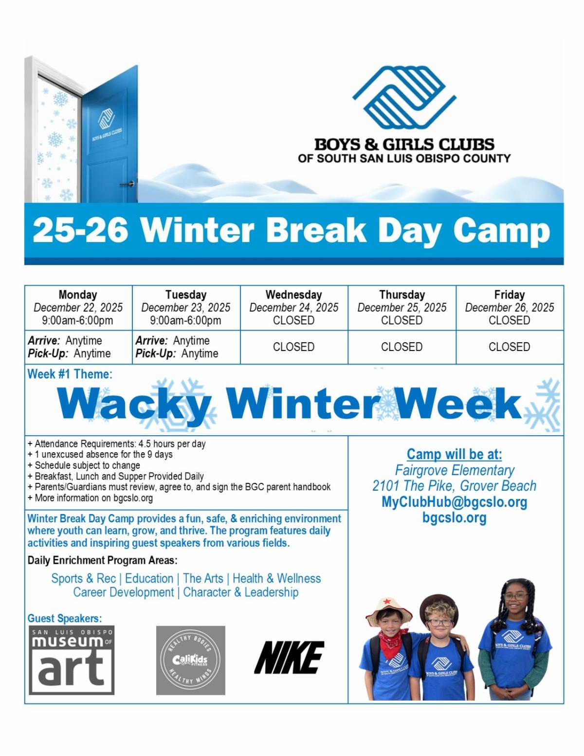 We still have a few spots available for our Before Winter Break Day Camp! Visit bgcslo.org/breakcamps for more information and to enroll. If you are interested in being added to our waitlist for the Winter Break Day Camp please email MyClubHub@bgcslo.org.