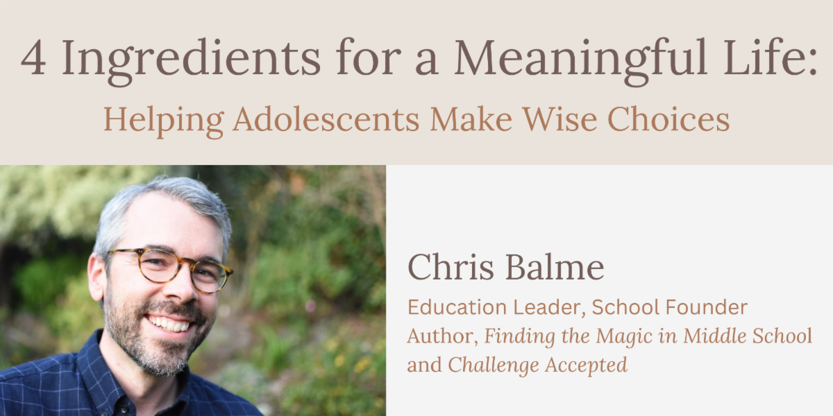 What helps tweens and teens make good choices? Chris Balme, education leader, writer, and school founder, presents Four Ingredients for a Meaningful Life: Helping Adolescents Make Wise Choices (October 22).