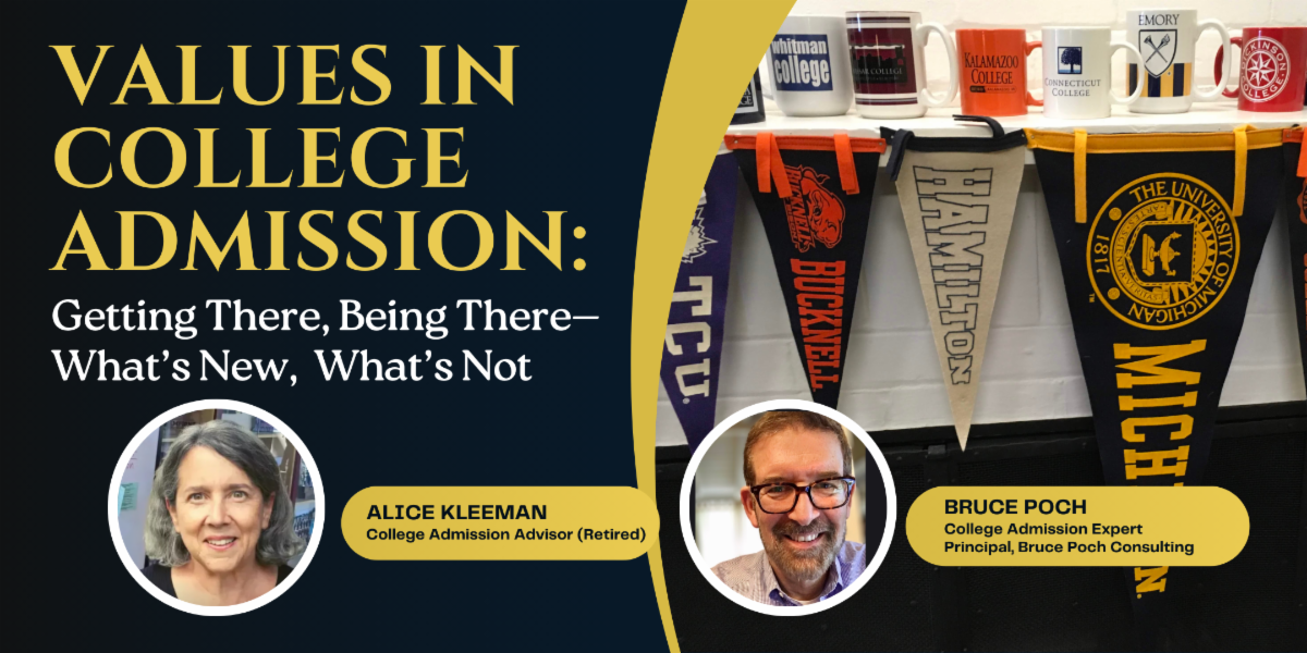 NEW! How should families navigate the new college admission landscape? Bruce Poch and Alice Kleeman join us for VALUES IN COLLEGE ADMISSION: Getting There, Being There—What’s New, What’s Not (October 30).