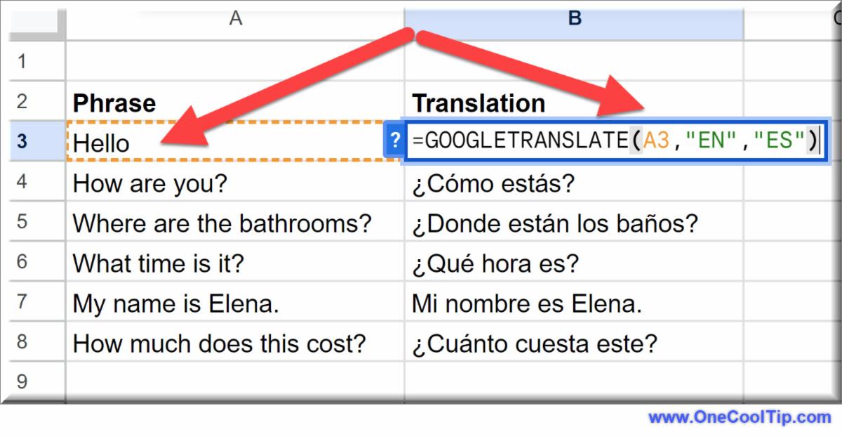 6. Cell A3 has "Hello". To translate it into Spanish, your formula in another cell would be =GOOGLETRANSLATE(A3, "en", "es").