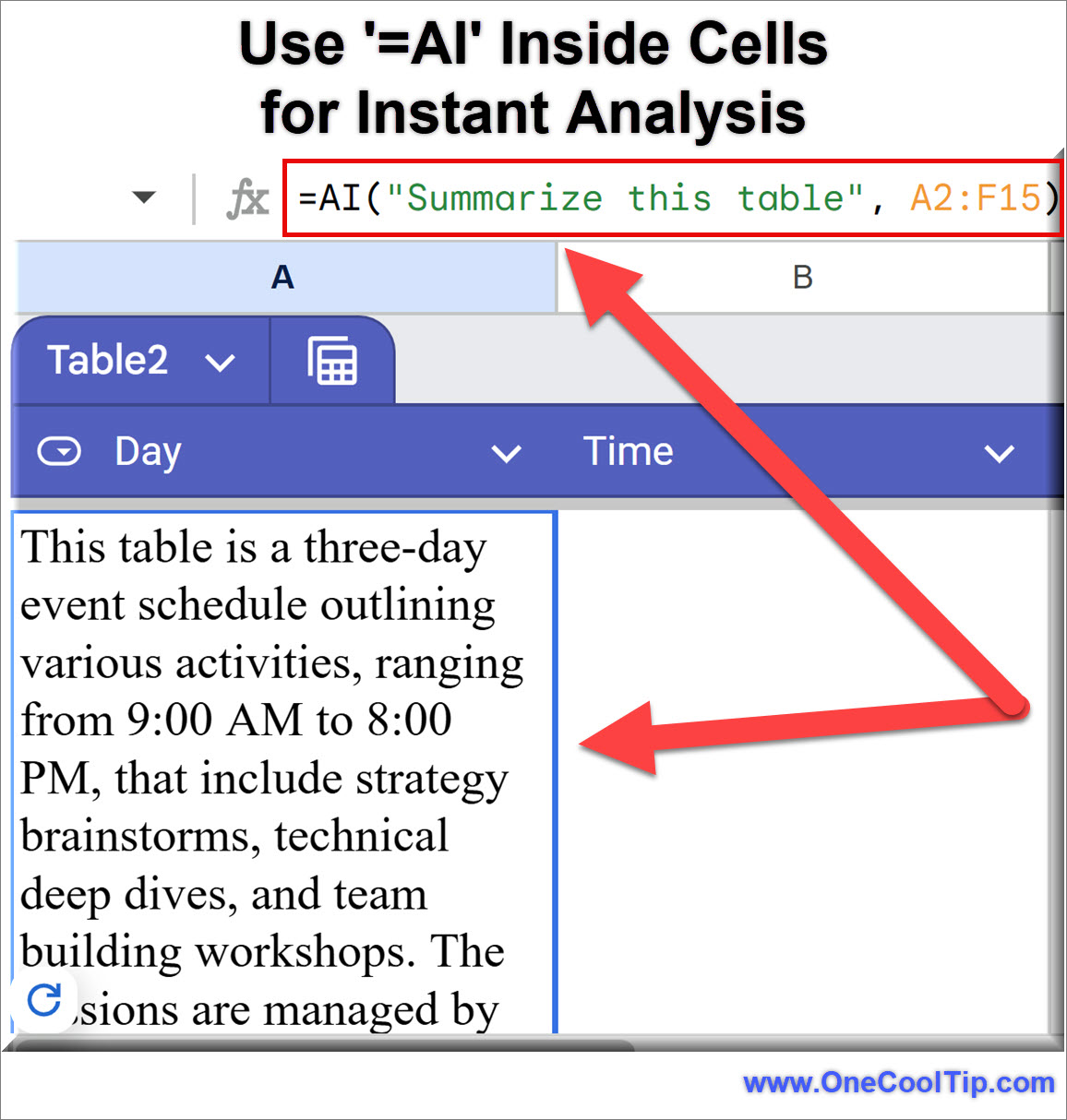 - Finally, the =AI() or =GEMINI() function lets you bring generative power directly into a cell, allowing you to summarize or categorize text at scale without leaving the document.