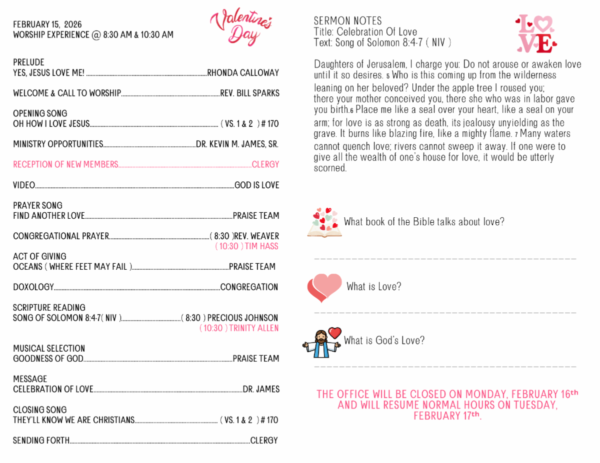 Dr. James's Sermon is entitled "Celebration Of Love" based on Song of Solomon 8:4-7 ( NIV)
