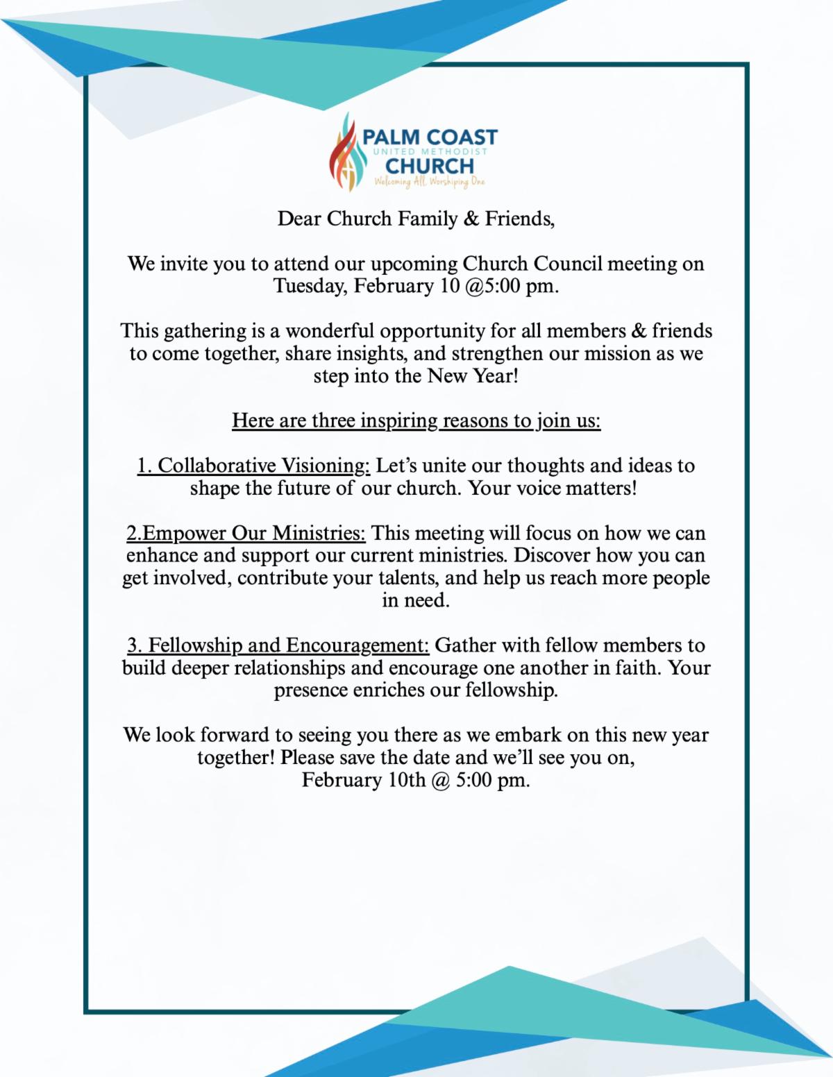 All are invited to attend the Church Council meeting, February 10th @ 6 pm.