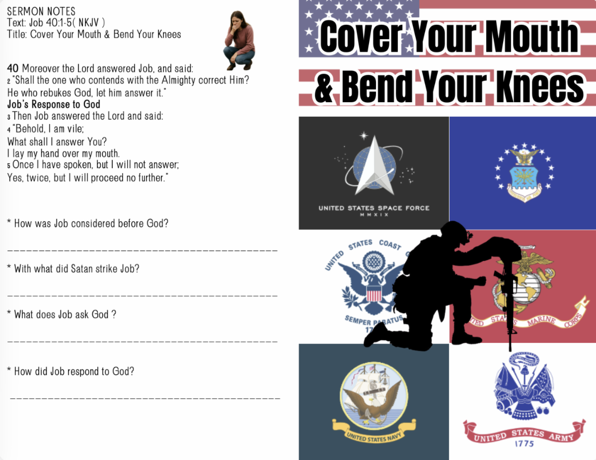 Dr. James Sermon is entitled "Cover your Mouth & Bend your Knees ā€œ based on Job 42 ( MSG)