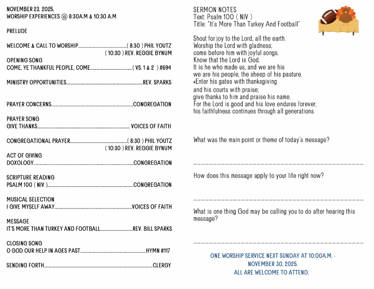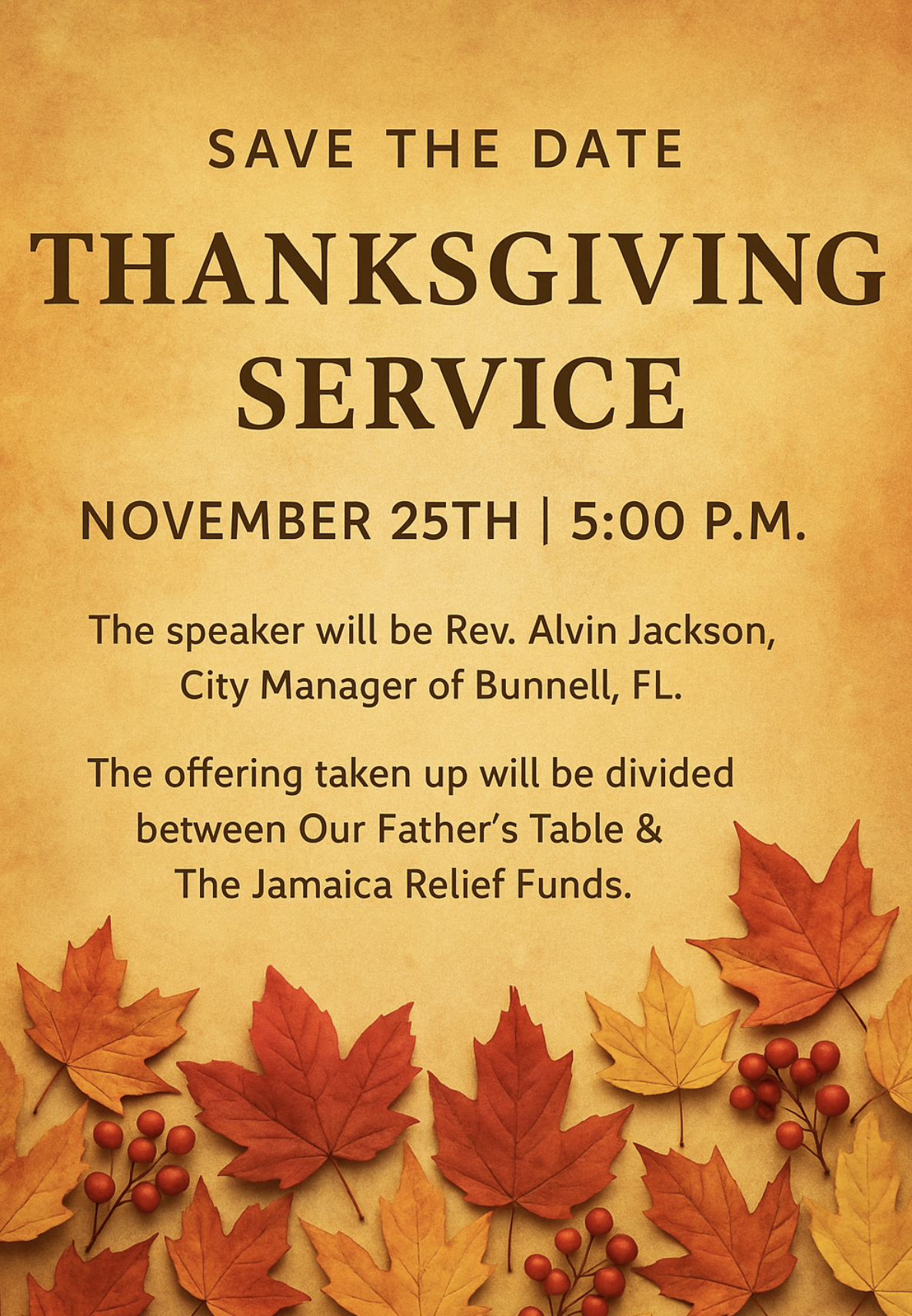 Thanksgiving is on Thursday, Nov. 27, 2025. For the seventeenth year, our church is collaborating with Team Feed Flagler to provide food for needy individuals and families in our community. For this, we need your help. Please consider volunteering in one or more of the following ways: