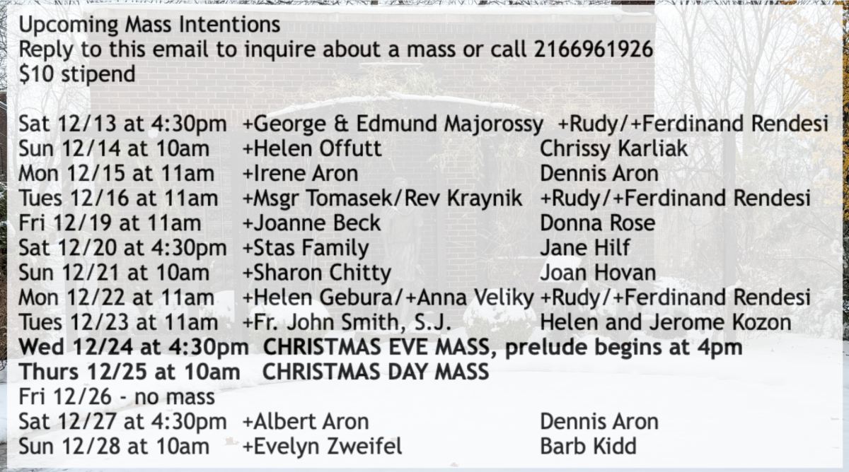 | | Our Giving Tree is up on the altar. Please bring your donations and place under the tree by December 14th. We will deliver all donations to the West Side Catholic Center. Thank you for your help! Give any monetary donation to an usher or place in the collection basket. | | | | Read the latest issue of Diocese of Cleveland's online magazine HERE. | | | Click the button below ⬇️ and add your cell number. We will ONLY send important event updates or cancellations due to weather or emergencies. Thank you! | | Set up a mass by filling out the form on our website (click picture above and scroll to Mass Request), or call the rectory 216.696.1926 or send an email to office@stwendelincleveland.org with the month/day you prefer. | | | |