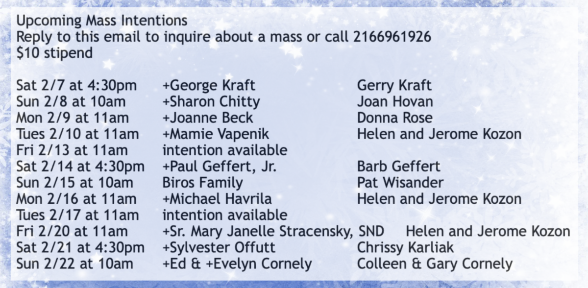 Pray for the health of Mary Chura, Jenny Weaver, Wayne Matlus, Linda Pacanosky, Dennis Vok, Denise Turner, Nancy Simala, Jane Hilf, Terry Chura, Red Rodio, Frank Novak, George Cummings, Steve Dabrowski, Larry Blasius, Roselyn Cowell, Fr. Kropac and for many special intentions for strength, mercy and healing.
