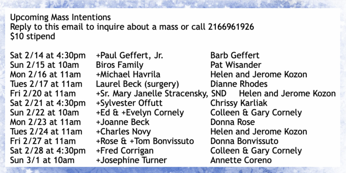 Pray for the health of Mary Chura, Jenny Weaver, Wayne Matlus, Linda Pacanosky, Dennis Vok, Denise Turner, Nancy Simala, Jane Hilf, Terry Chura, Red Rodio, Frank Novak, George Cummings, Steve Dabrowski, Larry Blasius, Roselyn Cowell, Fr. Kropac and for many special intentions for strength, mercy and healing.