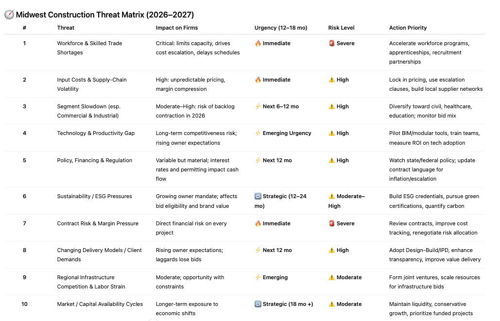 Here are some of the greatest threats facing the construction industry heading into 2026 — especially relevant for the AEC world you move in — along with how firms (and you, as a leader) might respond. I’ll frame each threat with what to watch + strategic implications for your role in the St. Louis/AEC community. In the following issues a deeper dive into each will be shared. Stay tuned in!