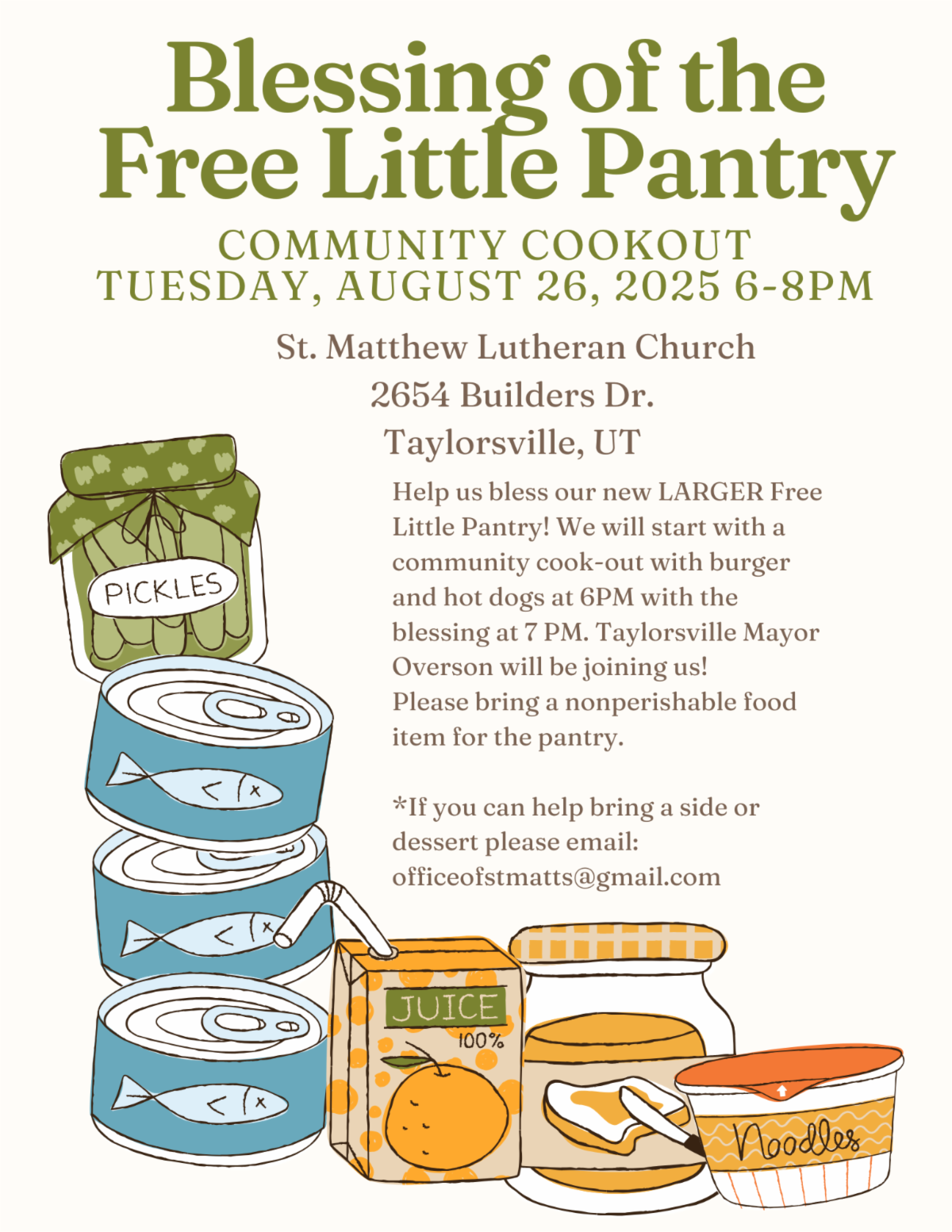 August 26, 6-8pm: Blessing of the Free Little Pantry at St. Matthew's Church in Taylorsville, Utah. All are welcome!