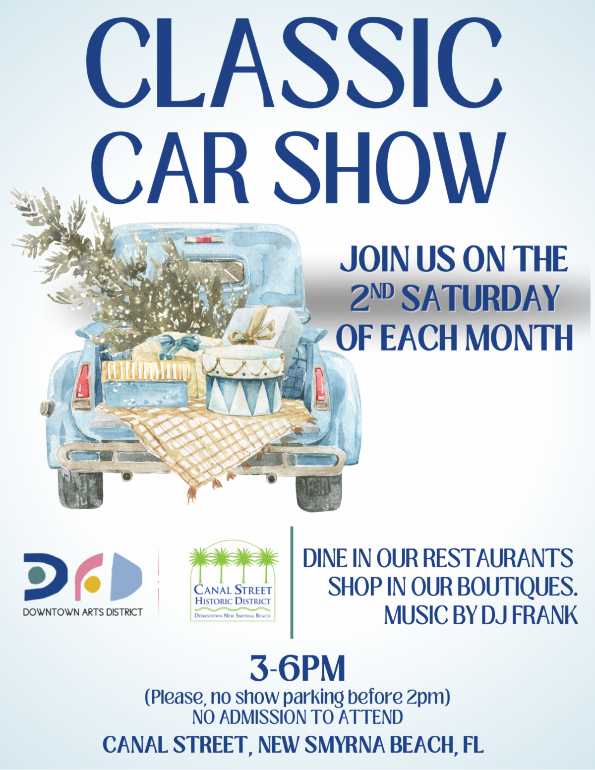 Every month on the second Saturday. Stroll beautiful Canal Street while viewing cars of all years, makes, and models. A new beginning for the tradition with the active participation of the Canal Street Merchants Association and the City of New Smyrna Beach. Music by DJ Frank.