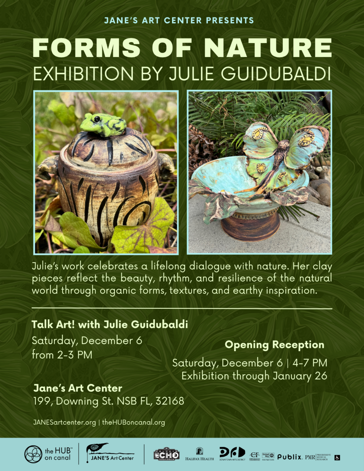 Visit our Downtown Arts District on the 1st Saturday of the month. Stroll down Canal, Douglas and Magnolia streets to visit and view the new exhibitions at these Arts not-for-profits. Enjoy the beautiful galleries and experience the amazing arts community here in New Smyrna Beach. While you are out and about, also stop by Wirth Gallery, and the other venues with art for sale, including The New Smyrna Beach Museum of History. Let the public art around our district put a smile on your face.