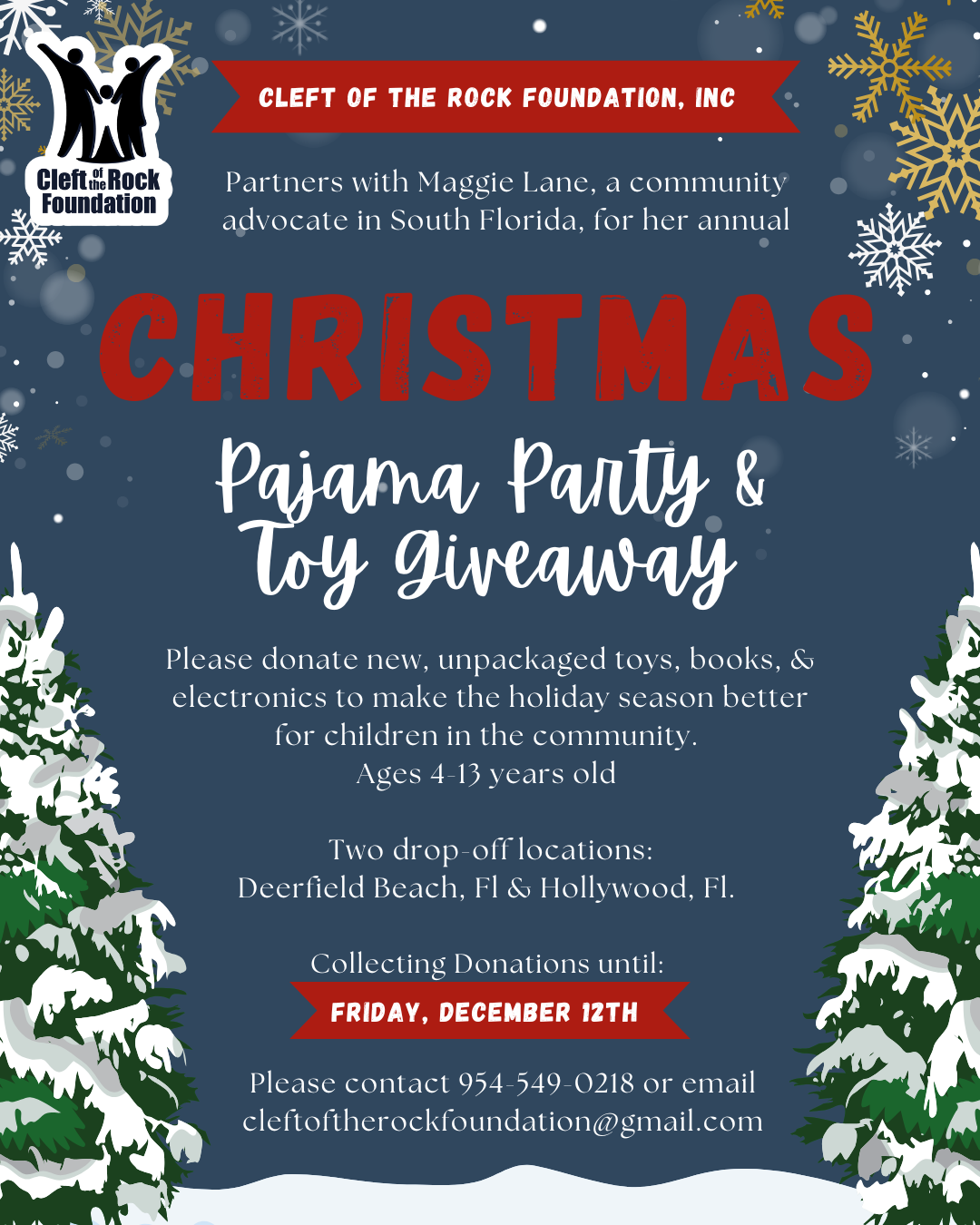 This year, Cleft of the Rock Foundation has partnered with Maggie Lane for her annual toy drive event. Every year, Ms. Lane puts on the Christmas Pajama Party & Toy Giveaway in the community. This year, the event will be at the Carver Ranches Daycare Auditorium in Hollywood, FL, and will feature toys, games, food & fun.