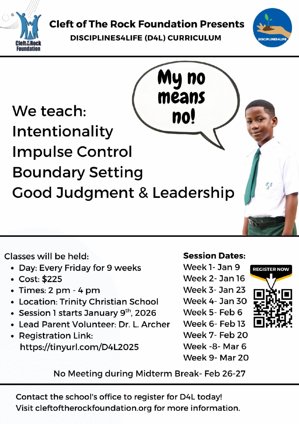 Cleft of the Rock Foundation is excited to announce that D4L will be inaugurated at Trinity Christian School in January 2026! It is a unique program for young people. Disciplines4Life is designed to address critical disciplines required for continuous growth and development in life. Our goal is to provide a holistic environment for students to learn and grow critical skills to enhance their lives. We look forward to this curriculum being shared widely with young people everywhere. To offer this curriculum at your church, school, or community center, contact COTR by filling in the contact form below.