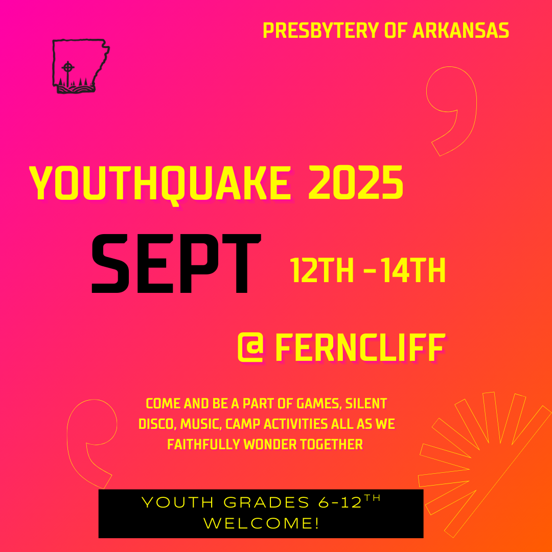Youthquake kicks off at 7pm on Friday, September 12th (make sure to eat dinner before you arrive!) and ends after breakfast and worship at 10am on Sunday, September 14th. The weekend will be filled with fellowship, faith, and fun as youth engage in small groups with people their age, large group worships and keynotes, and recreational activities such as energizers and Silent Disco! Our leadership includes Rev. John Arnold, Rev. Dr. Susan Arnold, and music led by Andy Watson of John Knox Ranch! Registration is $155/ participant, financial assistance is available (contact Sarah at arpres.ateam@gmail.com for more information). Deadline to register is September 1st.