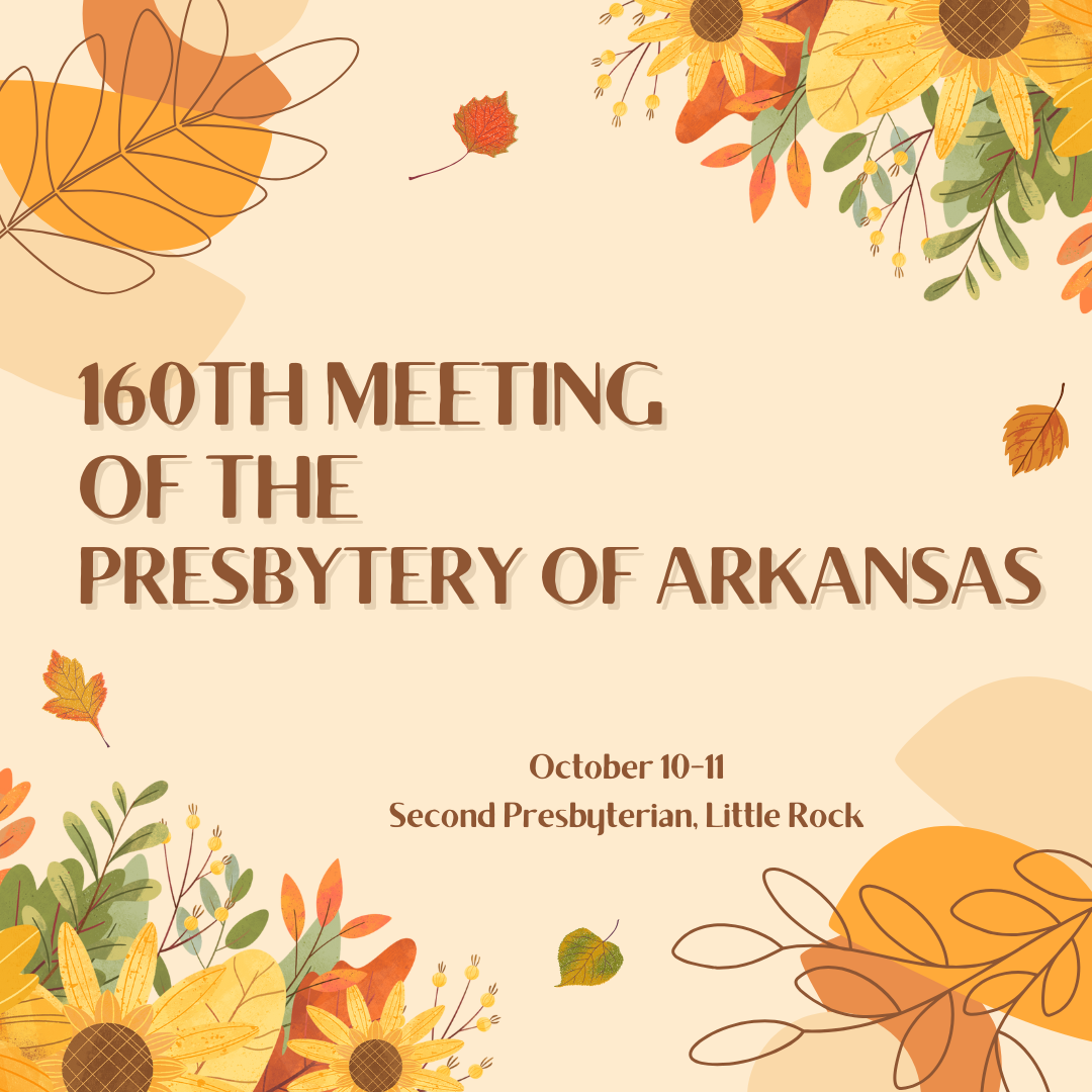 The 160th Meeting of The Presbytery of Arkansas will take place on October 11 at Second Presbyterian in Little Rock. The registration form and host packet will be available the first week of September.