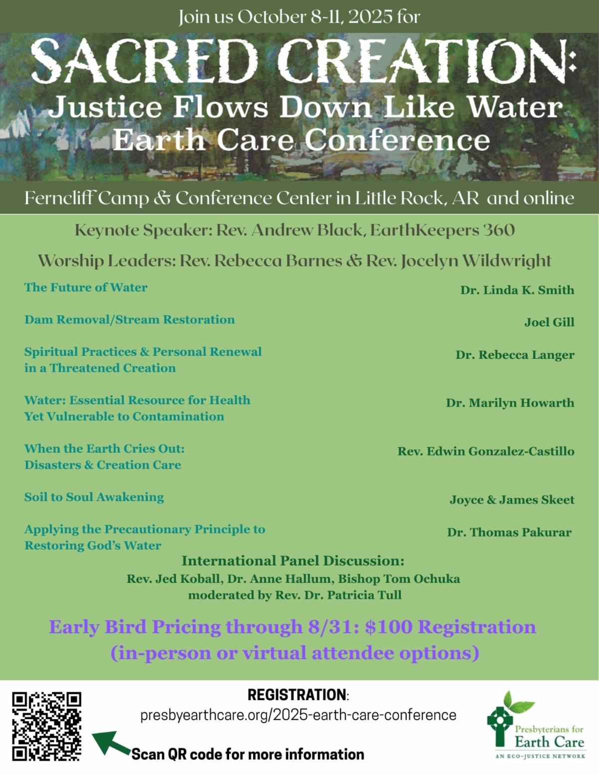 Please join us for Presbyterians for Earth Care's biennial Earth care conference, Sacred: Creation: Justice Flows Down Like Water. If you are a member of an Earth care congregation, are involved in your congregation's Earth care team, or are simply curious and want to learn more about faith-based Earth care, this event is for you! We will gather Oct. 8-11 at Ferncliff Camp and Conference Center in Arkansas to explore water as sacred and essential, environmental justice and equity, faith-based climate action, and experience community, worship, and renewal. Please see the attached flyer for registration information.