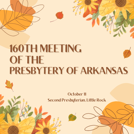 The 160th Meeting of The Presbytery of Arkansas will take place on October 11 at Second Presbyterian in Little Rock starting at 9:00 AM with registration beginning at 8:30 AM. Registration is now open using the button below. The main packet will be available October 3rd on the presbytery website's meeting page.