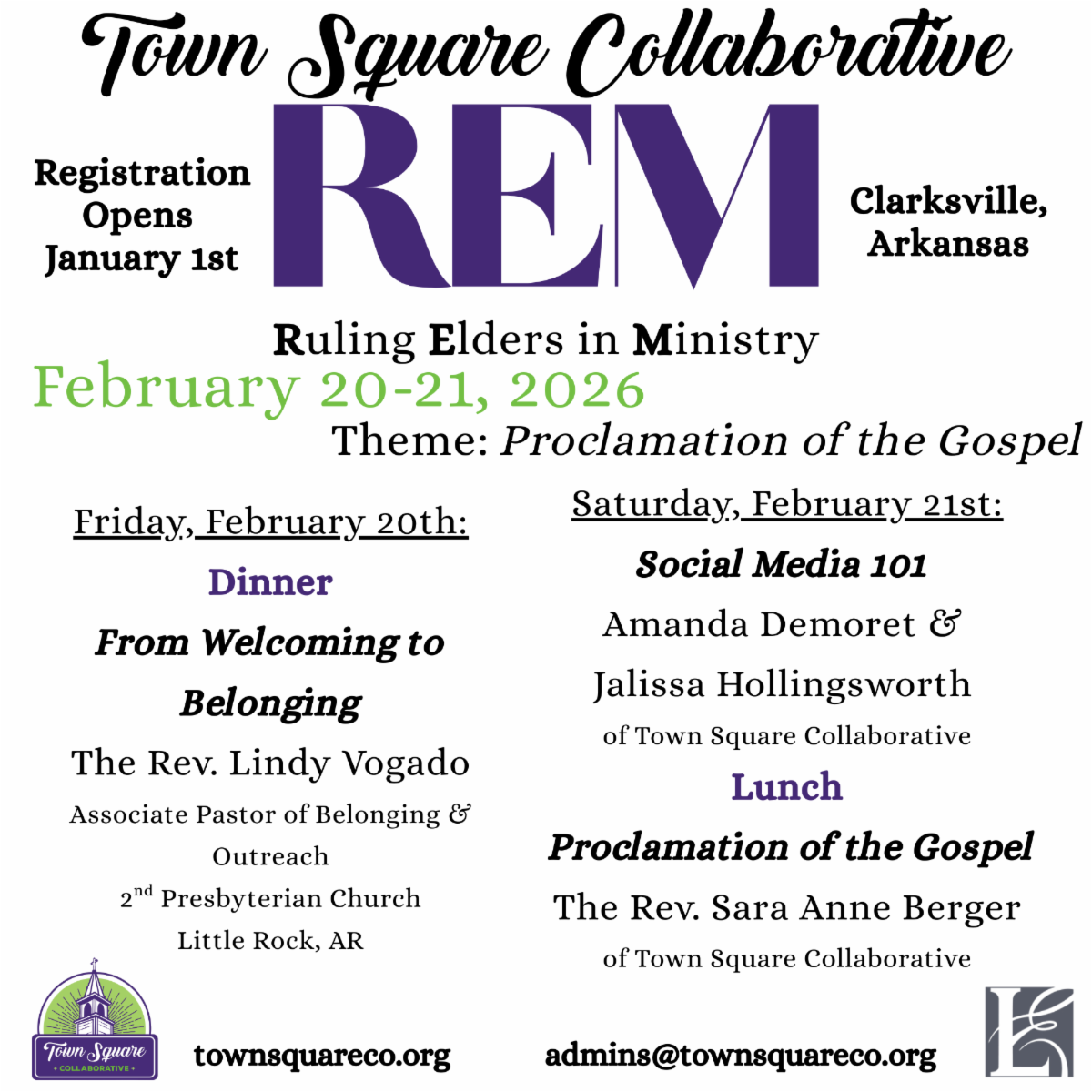 At this REM gathering we'll be broadly thinking about "The Proclamation of the Gospel", and specifically about proclamation--about how we proclaim as churches, and how that proclamation invites and welcomes folks into our congregations. We'll have the Rev. Lindy Vogado from 2nd Presbyterian Church, Little Rock, to present about welcoming and belonging, on Friday night; and then Saturday, we'll have Town Square Collaborative program assistant, Amanda Demoret, and student intern, Jalissa Hollingsworth, leading a workshop on Social Media 101 for churches, and Rev. Sara Anne Berger, the assistant director of Town Square Collaborative, will lead a workshop about our unique proclamation as individual churches of Jesus Christ.
