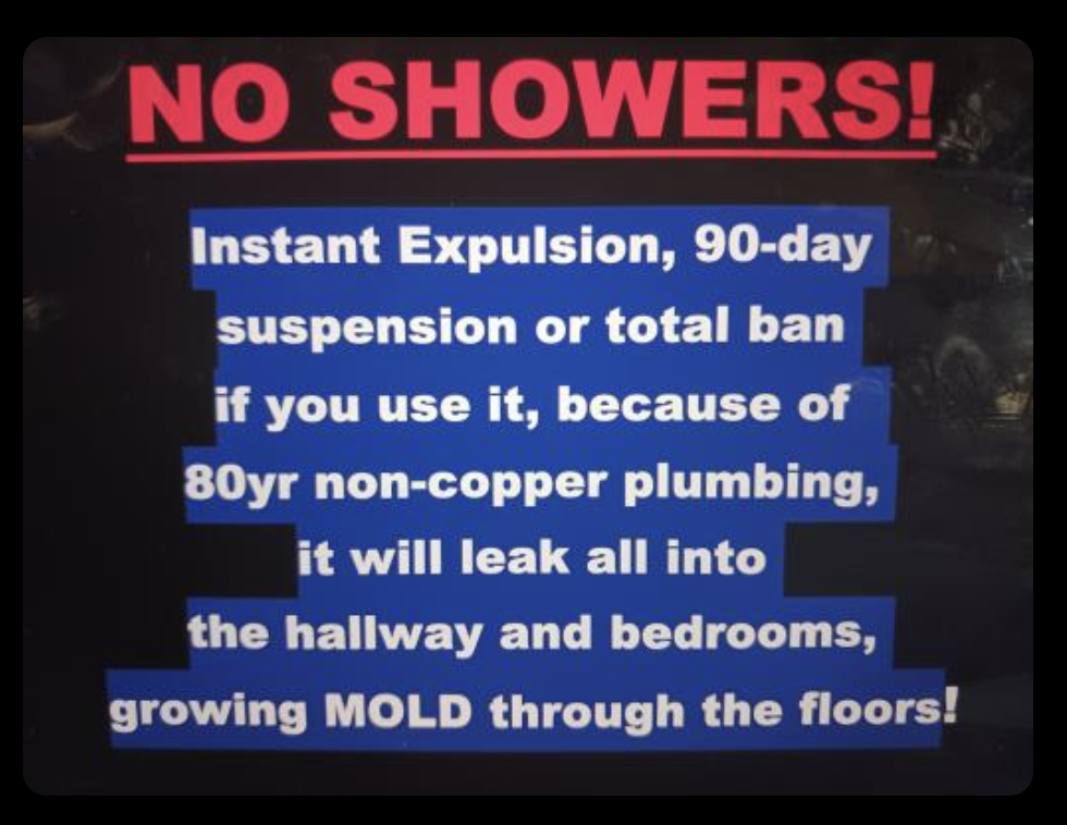 IN THE BATHROOM! The non-copper, 80 year old plumbing is barely hanging on, and using the shower causes water to leak out into the hallway and into all 3 bedrooms!