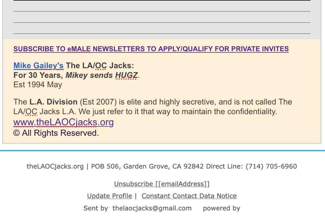 PLEASE note that the L.A. Division (founded 2007; which is by invite and nomination acceptance only) is not called The LA/OC Jacks LA, and has a secret, private name and website given when members are accepted. LA has a separate Twitter feed that is under the secret name.