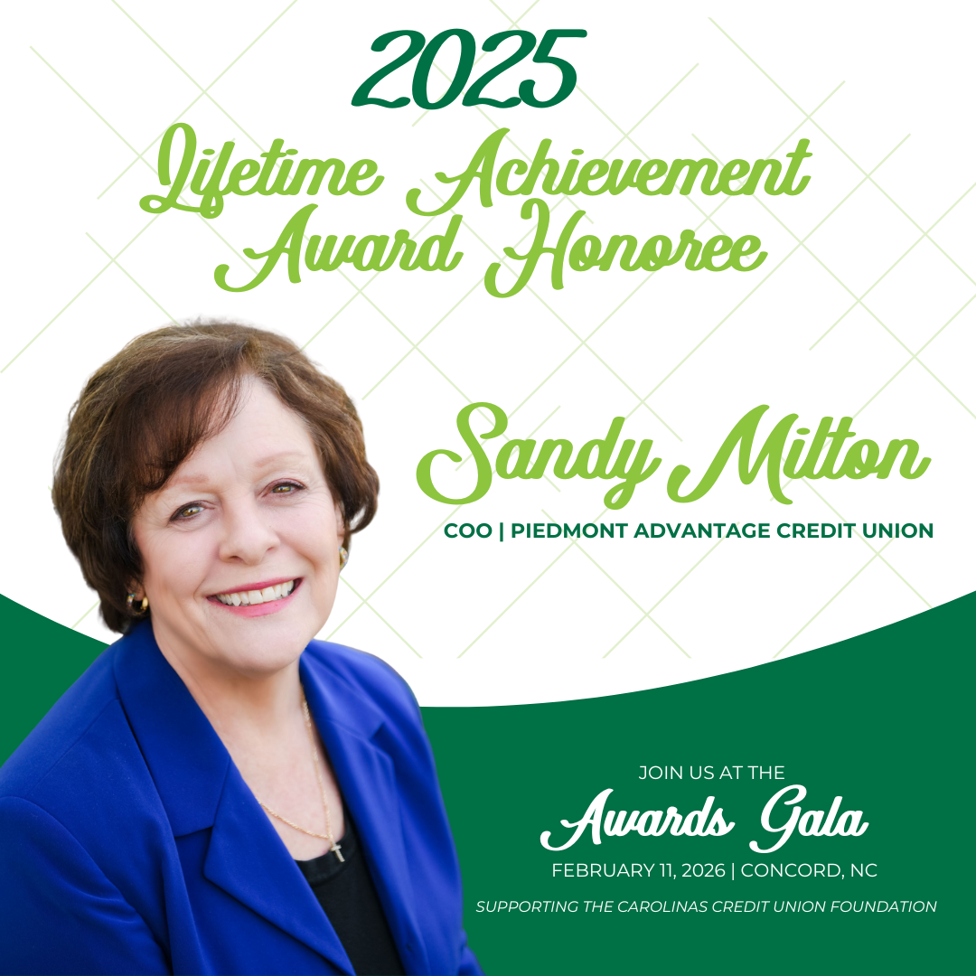 Lifetime Achievement Award: Sandy Milton - honored for more than four decades of exceptional leadership, mentorship, and service to the credit union movement.